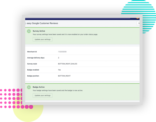 Once installed, you simply need to add your Merchant ID, tell us how long it typically takes for a customer to receive an order and save your settings!