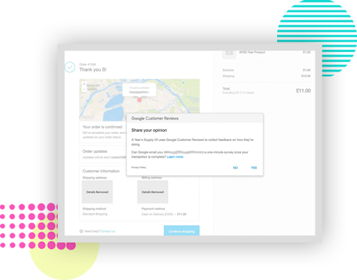 Customers who place an order on a participating Merchant store will be presented with a pop-up message on the Order Status Page (Thank you page) asking them if they wish to opt-in to receive an email from Google about their experience. If the customer opts-in, they will receive an email from Google once their order is estimated to have arrived.