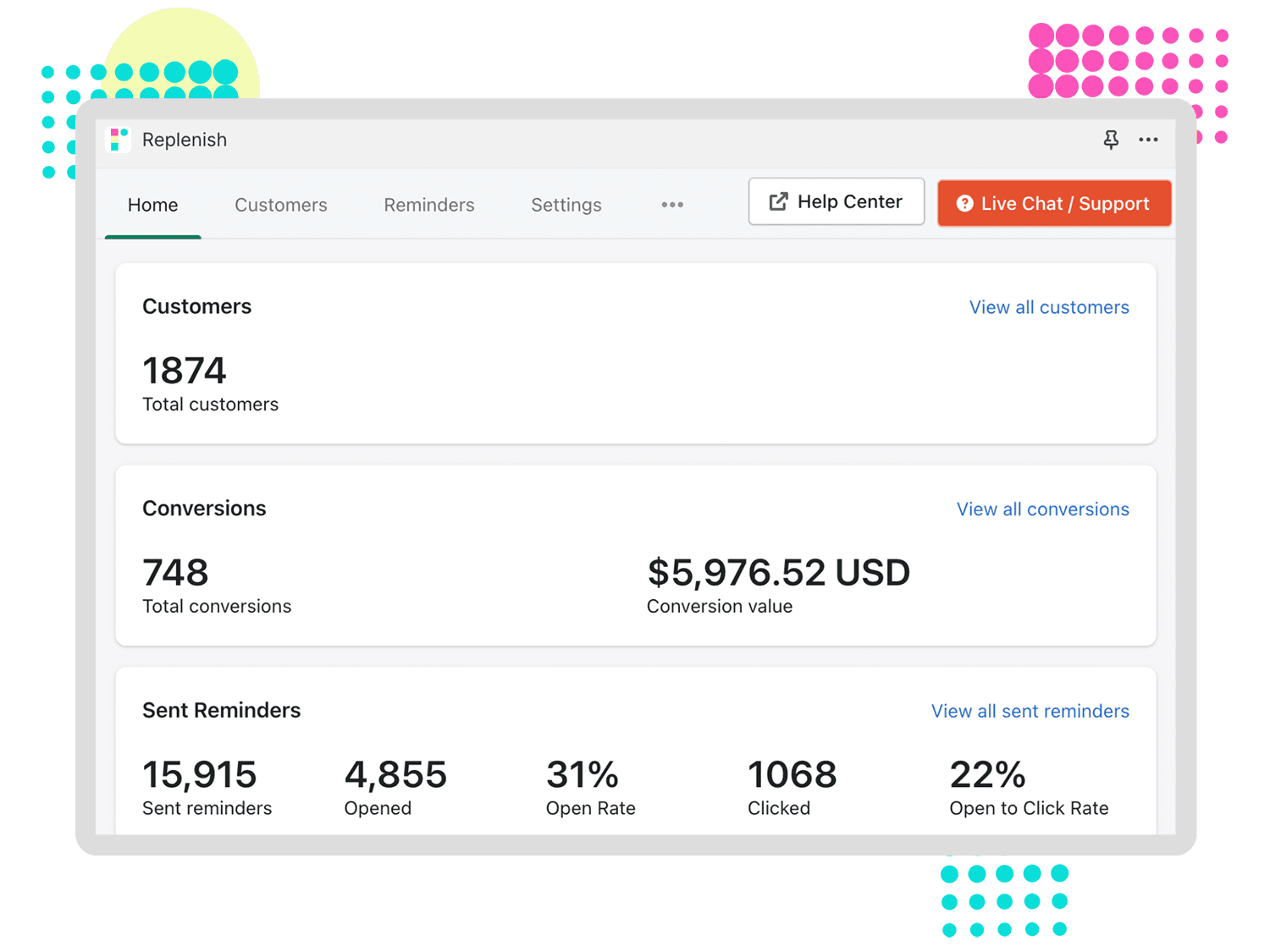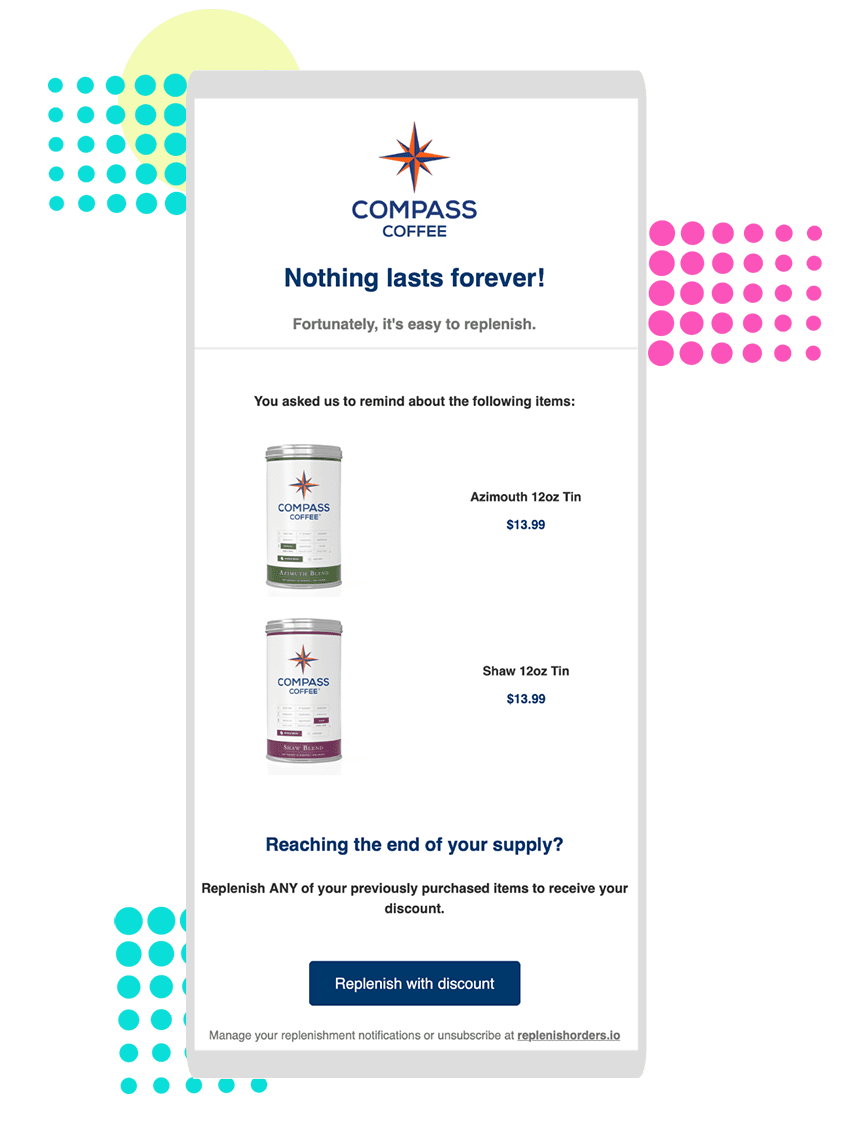 Replenish gives the control to the customer by allowing them to tell you how fast they consume your products. You can scrap your generic 30 days after email reorder reminder and allow your customers to set their own high converting reminder email